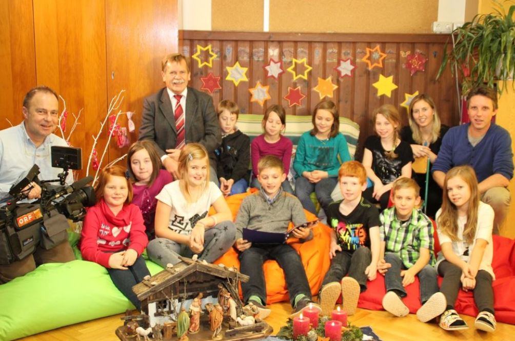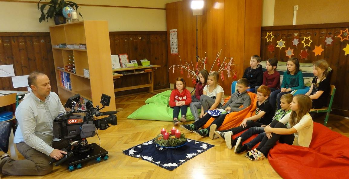Heute war es soweit! Ein Team des ORF-Niederösterreich besuchte uns an der Schule, um Sebastians Adventgeschichte zu filmen. Sorgfältig wurde der passende Platz in der Klasse ausgesucht und die Sitzanordnung der Kinder festgelegt. Eine Krippe und der gemeinsam gebundene Adventkranz rundeten das Ambiente ab. Sebastian trug seine Geschichte wirklich sehr gekonnt vor und das nicht nur ein, sondern ungefähr zehn Mal, da die Kinder aus verschiedenen Positionen aufgenommen wurden und auch ein vorbeifahrender Traktor und ein ausgefallener Lichtakku für kurze Unterbrechungen sorgten. Anschließend wurden die Kinder auch noch beim Basteln gefilmt.