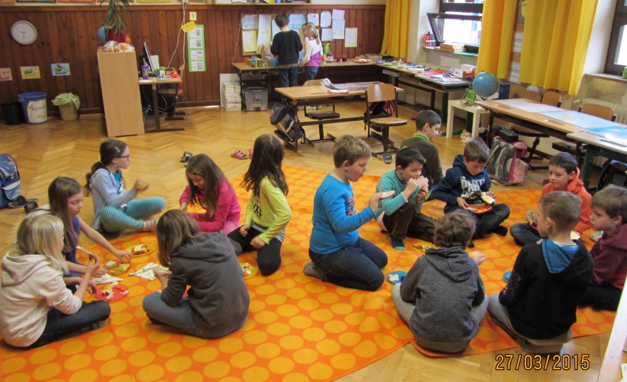 Die 3. Klasse gestaltete am Freitag vor den Ferien mit ihrer Klassenlehrerin Frau Helmel ein Osterpicknick. Die Schüler und Schülerinnen bereiteten zunächst ein leckeres Buffet vor und verspeisten dann die Jause auf den Picknickdecken in der Klasse.