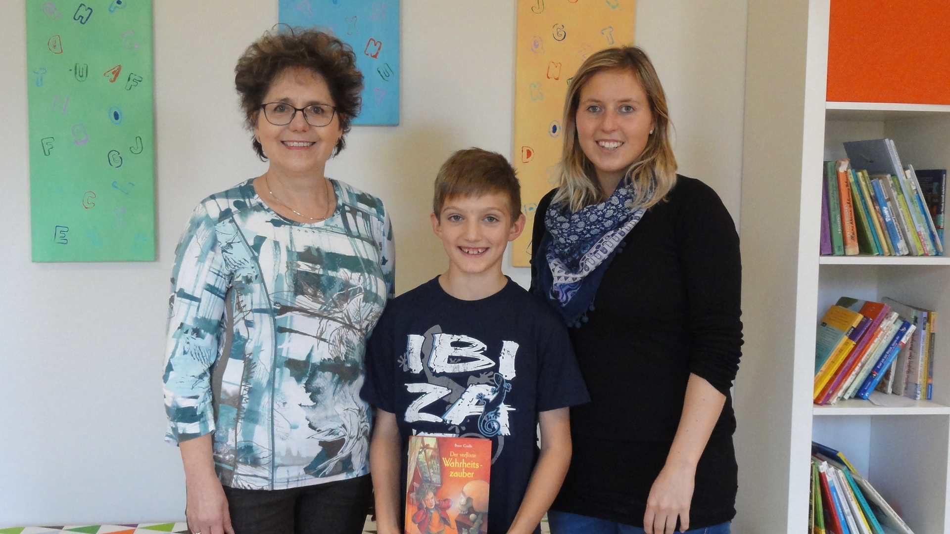 Bibliotheksleiterin Frau Käfer und Frau Janz freuen sich mit Sebastian.
