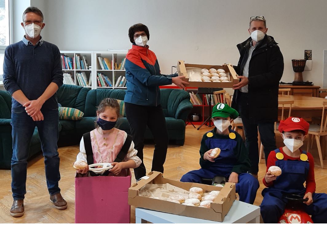 Mit wirklich tollen Verkleidungen kamen unsere Volksschulkinder und auch die Lehrerinnen am Faschingsdienstag in die Schule. Zur Freude aller Kinder und Lehrkräfte, brachten uns Herr Bürgermeister Schachner und Frau Sollböck Faschingskrapfen für die große Pause. Diese wurden dankenswerterweise von der Gemeinde finanziert und Frau Sollböck organisierte die Aktion. Herzlichen Dank dafür, auch im Namen aller Schüler/innen und Lehrer/innen der Mittelschule, welche ebenfalls mit Krapfen versorgt wurden!