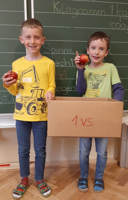 | Der Elternverein hat sich wieder bereit erklärt, im Mai alle Schülerinnen und Schüler sowie alle Lehrkräfte der Volks- und Mittelschule 1x pro Woche mit frischen Äpfeln zu versorgen. Termine: • MO 3.5. • MO 10.5. • MO 17.5. • DI 25.5. Herzlichen Dank an unseren Elternverein für diese gesunde Idee und für die Unterstützung. Foto: Zwei Kinder der 1. Klasse Volksschule mit ihrer "Apfelkiste" |