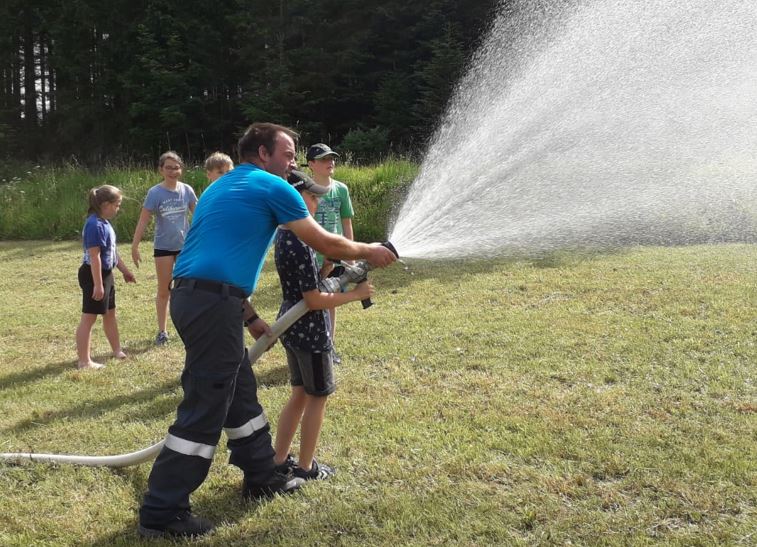 Danach ging es mit den Feuerwehrautos zum Übungsplatz ins Kothbergtal. Dort konnten die Kinder unter anderem Folgendes ausprobieren: Begutachten des Feuerwehrautos und ausprobieren der Bergeschere und des Spreitzers. Schläuche verlegen, einen "Brand löschen" und durchs Wasser laufen, das war besonders lustig.