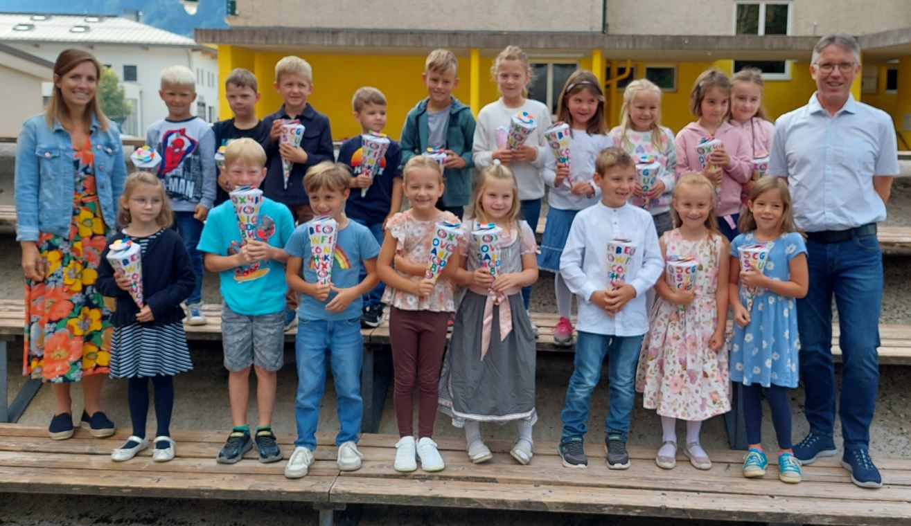 Als Erinnerung an den allerersten Schultag machten wir im Schulhof ein Foto mit Klassenlehrerin Frau Enöckl und Herrn Direktor Holzgruber.