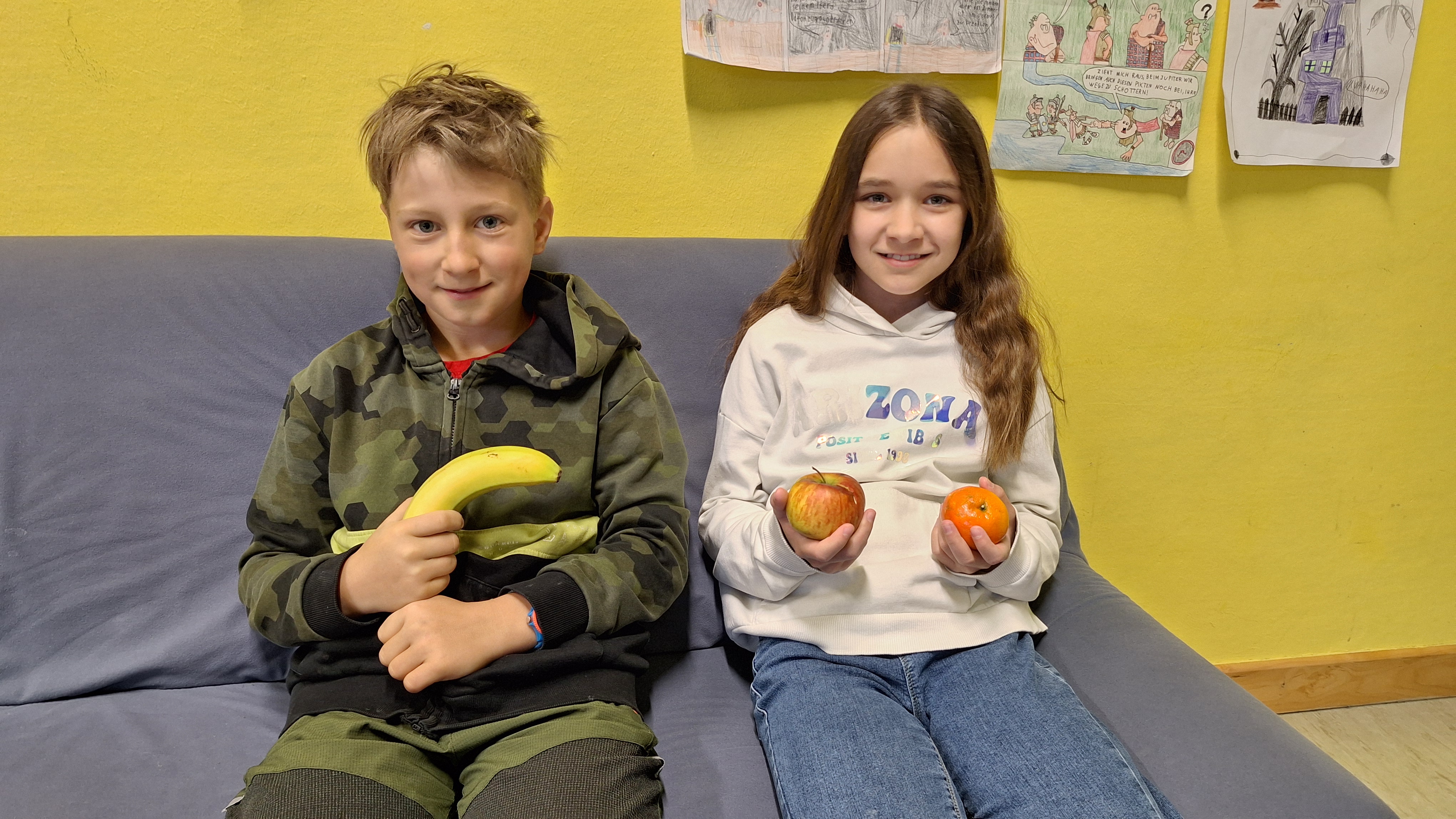| Unser Elternverein und die Gesunde Gemeinde haben sich dankenswerterweise wieder bereit erklärt, im April und Mai alle Schülerinnen und Schüler der Volks- und Mittelschule sowie alle Lehrkräfte 1x pro Woche mit frischem Obst (Äpfel, Bananen und Mandarinen) zu versorgen. Herzlichen Dank an unseren Elternverein und Frau Jutta Thomasberger von der Gesunden Gemeinde für die Unterstützung. Foto: Zwei Kinder der 1. Klasse der Mittelschule mit Obst für die Pause |