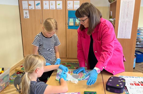 Die Schülerinnen und Schüler erfuhren Wichtiges über das Absetzen eines Notrufs, versorgten praxisorientiert selbst kleinere Verletzungen und führten Erste Hilfe Maßnahmen an „kranken“ MitschülerInnen durch.