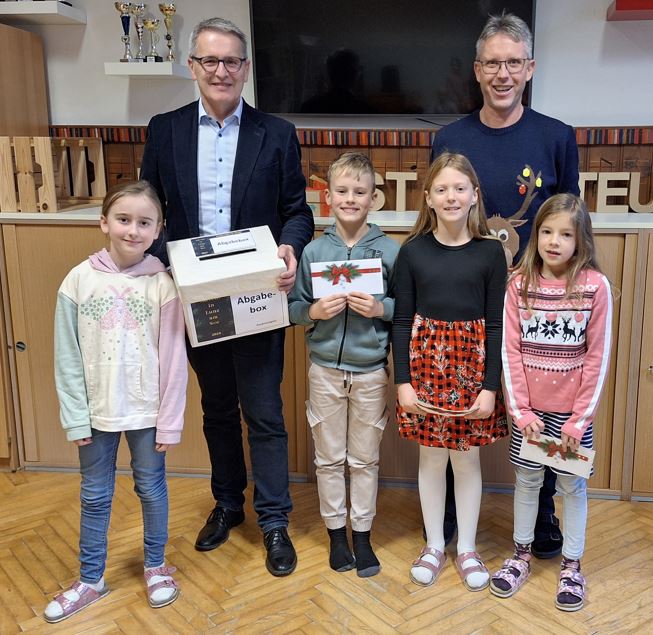Herr Bgm. Schachner und Herr Direktor Holzgruber freuen sich mit dem Glücksengerl und den Preisträgern. Die glücklichen Gewinnerinnen und Gewinner erhielten von der Gemeinde Lunz Einkaufsgutscheine im Wert von € 10.-, € 20.- bzw. € 30.-. Frohe Weihnachten!