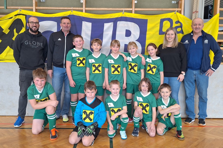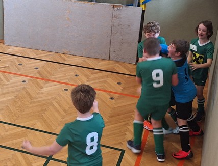 | Am 14.1.2025 fand in unserer Turnhalle das diesjährige VS-Hallenturnier (Sumsi-Cup) statt. Heuer waren erstmals wieder so viele Mannschaften am Start, dass die Vorrunde in zwei Gruppen ausgetragen wurde. Mit einem Sieg war unser Team nach den drei Gruppenspielen punktegleich mit zwei weiteren Mannschaften. Nur aufgrund des schlechteren Torverhältnisses spielten unsere Burschen und Mädls gegen die VS St. Georgen um Platz 7 und 8. Nach einem torlosen Unentschieden fiel die Entscheidung im 7m-Schießen. Dabei hielt unser starker Tormann Simon einen Strafstoß und alle unsere Schützen (Jonas, Luis und Ben) verwerteten souverän. Somit belegten wir schlussendlich den 7. Platz. |