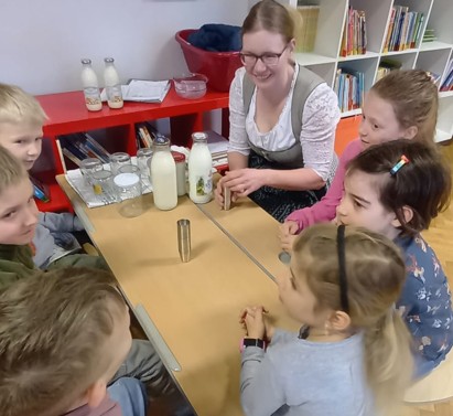 Milchverkostung bei Frau Hauß Die Kinder wissen nun ganz genau, woran sie die Herkunft österreichischer Lebensmittel erkennen. Zum Schluss durften die Kinder, die selbst geschüttelte Butter auf ein Bauernbrot streichen und mit viel Schnittlauch, Gemüse und den Frischkäsebällchen verspeisen.
