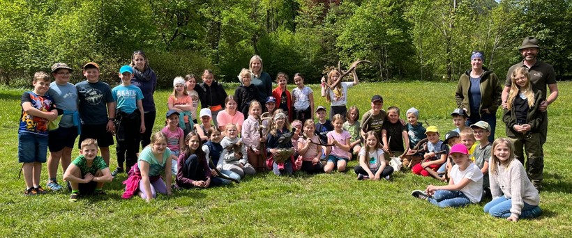 Am Mittwoch, den 14.5.2025, folgten die 3. und 4. Klasse (begleitet von den Klassenlehrerin Frau Lechner, Frau Haider sowie Frau Brandhofer und Frau Janz) der Einladung von Bernd und Annette Puritscher zu einem Wald- und Wildtag in der Forstverwaltung Seehof (Kupelwieser). Paula Puritscher erzählte von verschiedenen Hunderassen und ihren Besonderheiten. Ausgehend vom Schloss erkundeten die beiden Klassen den Wald in der näheren Umgebung und entdeckten an verschiedenen Plätzen präparierte Waldtiere, Trophäen und die großen Bäume in der Au hinter dem Schloss.