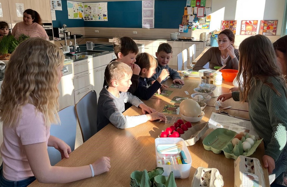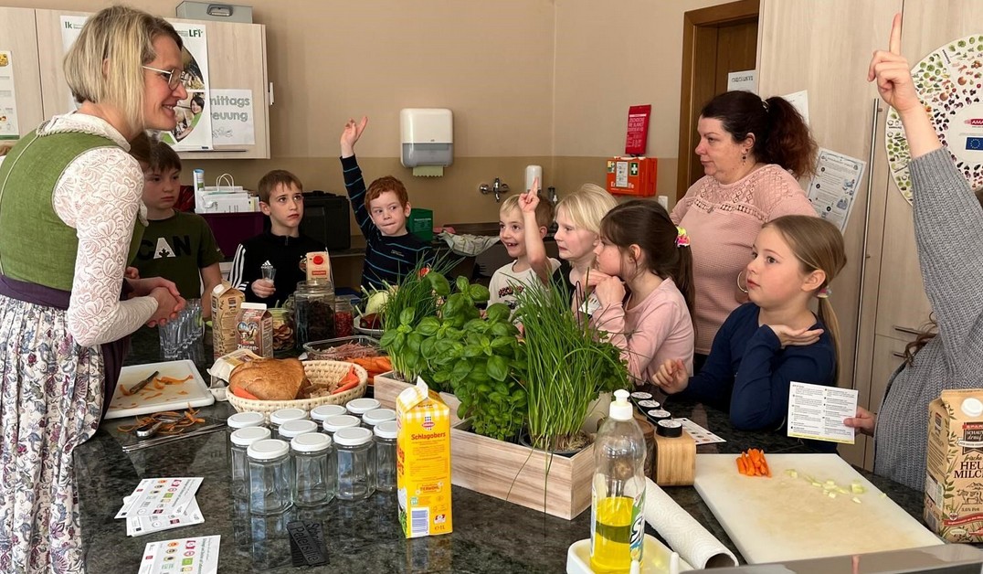 Am 23.3. besuchten die Lunzer Bäuerinnen in den ersten beiden Stunden die 2.Klasse. Nach der Begrüßung und Vorstellung in der Klasse ging es in die Schulküche. Dort lernten die Kinder an zwei Stationen: Station 1: Wissenswertes rund ums Ei: Herkunft, Lebensmittel mit Eiern, Größe von Eiern, unterschiedliche Eier verschiedener Tiere, Basteln eines Huhns, „Eierpecken“, Eiaufstrich machen