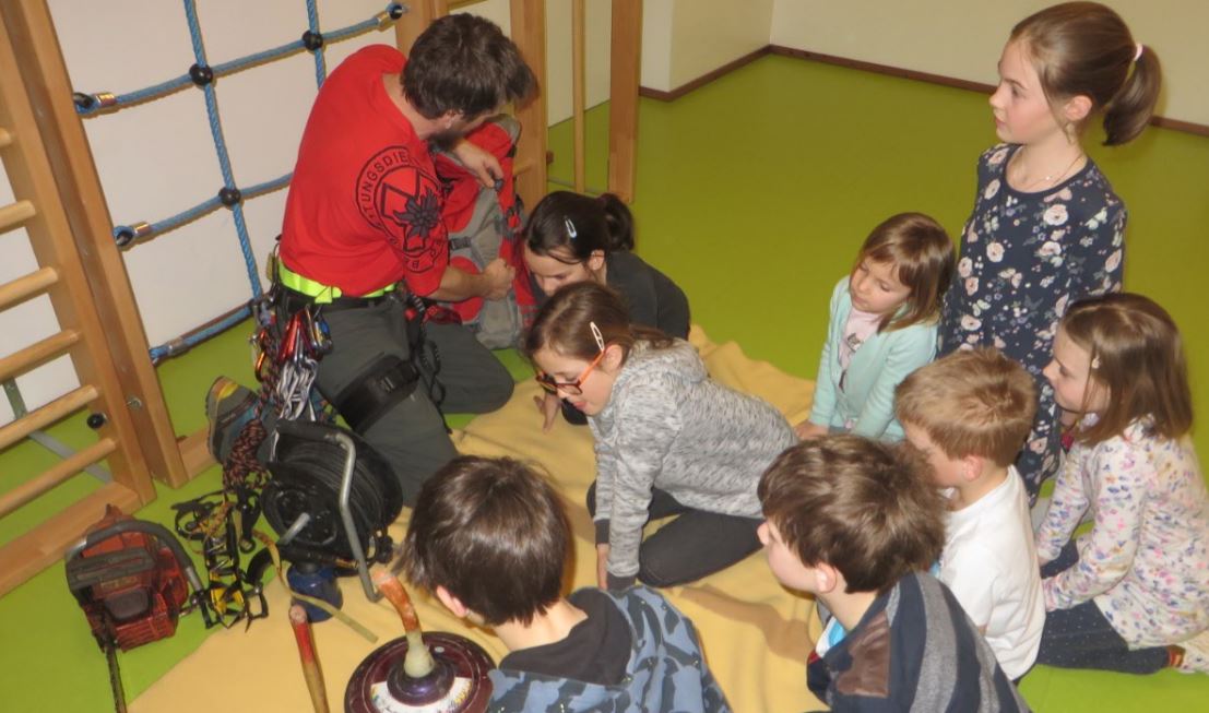 Am 16.3.2018 stand das 2. Treffen im Rahmen des Projekts "Einsatzkräfte" von Frau Helmels 3. Klasse mit den Vorschulkindern des KIGAs auf dem Programm. Dieses Mal hatten die Kindergartenpädagoginnen Sigrid Holzgruber und Martina Huber Stationen mit vielen Leseaufgaben und anderen Aufgaben zum Thema Bergrettung zusammengestellt, welche die Kinder wie immer in Gruppen aufgeteilt durchmachen konnten. Im Turnsaal zeigten Herr Pumhösel und Herr Heigl den Kindern, was sich so alles im Rucksack eines Bergretters befindet und worauf bei einer Bergung einer verletzten Person zu achten ist. Ein Highlight war sicherlich die simulierte Hubschrauberbergung, bei der die "verletzten Kinder" mit der Trage in die Höhe gehoben wurden. Nach einer gemeinsamen Jause durften sich die Kinder dann auch noch an der Suche nach einem "Vermissten" mit dem Lawinenpipserl beteiligen. Herzlichen Dank nochmals an die beiden Bergretter für die lehrreichen Stunden, das wirklich tolle Programm und die Unterstützung unseres Nahtstellenprojekts. |