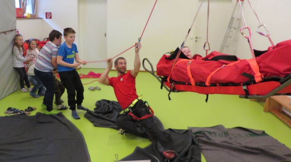 Was gehört alles zur Ausrüstung eines Bergretters? simulierte Hubschrauberbergung eines Verletzten Stationenbetrieb mit den Großen als Lehrer |