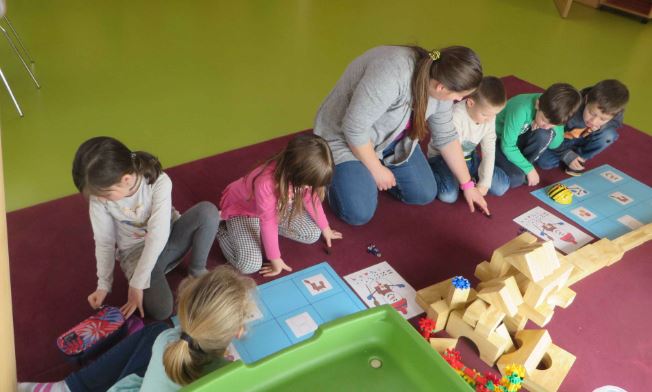 "Stille Post" und Bewegungsparcours im Turnsaal Begriffe mit den Bee-Bots wiederholen |