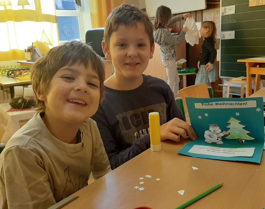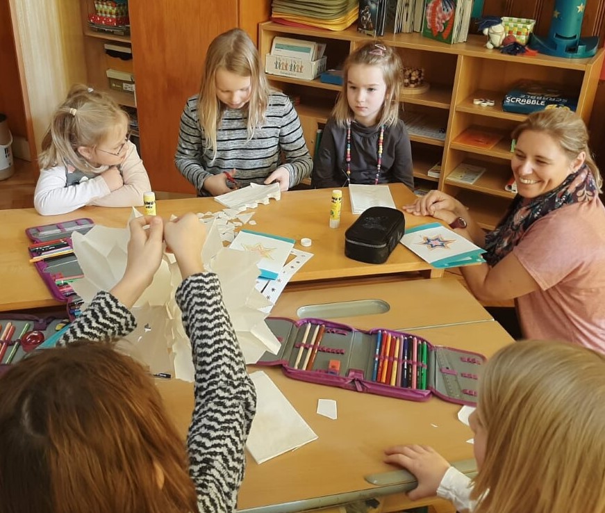 Am 11.12.2019 lud Frau Jagersberger mit ihren Kindern der 4. Klasse die KIGA-Vorschulkinder zu einer gemeinsamen Weihnachtsbastelstunde in die Volksschule ein. Die großen Kinder hatten das Bastelmaterial schon vorbereitet und nach der Einteilung in Gruppen ging es auch schon los. Unterstützt von den Schulkindern konnten die KIGA-Kinder Papiersterne und aufklappbare Weihnachtskarten gestalten. Nach getaner Arbeit lasen die Großen den Kleinen im Leseraum noch aus verschiedenen Büchern Geschichten vor. Ganz im Sinne unserer Nahtstellenarbeit war das Treffen für Frau Jagersberger gleichzeitig eine Möglichkeit zum ersten näheren Kennenlernen ihrer zukünftigen Schülerinnen und Schüler.