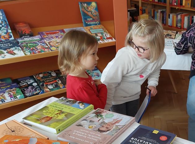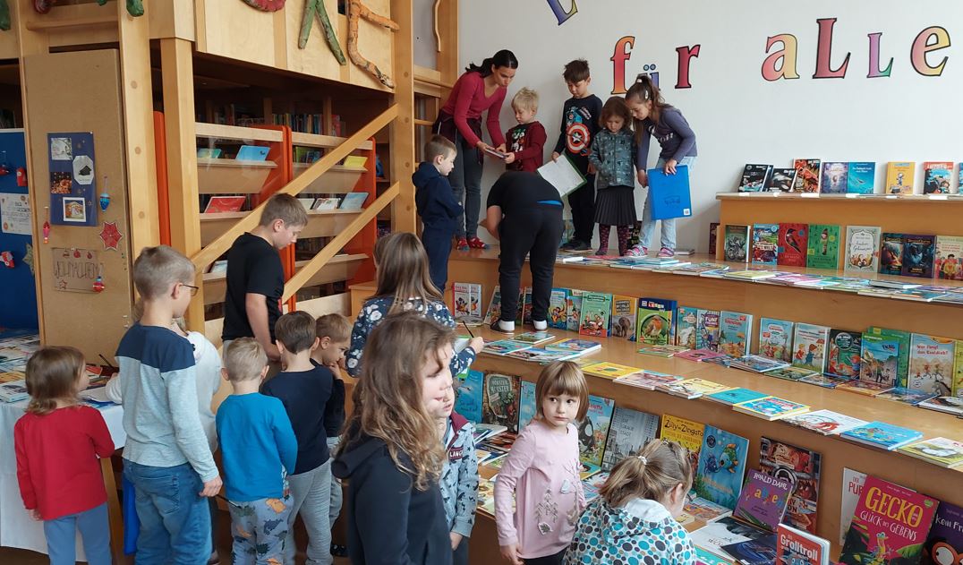 Sogar im Rahmen der Buchausstellung "arbeiten" wir institutionsübergreifend. So halfen die Kinder der 3. und 4. Klasse den Mittelgruppen- sowie Vorschulkindern des Kindergartens beim Auswählen der Wunschbücher.