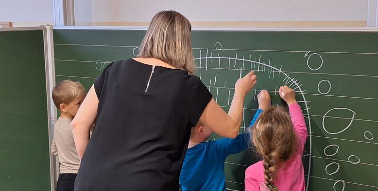 Außerdem lernten die Vorschulkinder an der Tafel wie man (mit Kreide) richtig Striche und Kreise zeichnet.