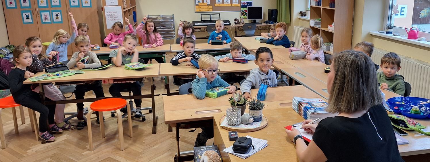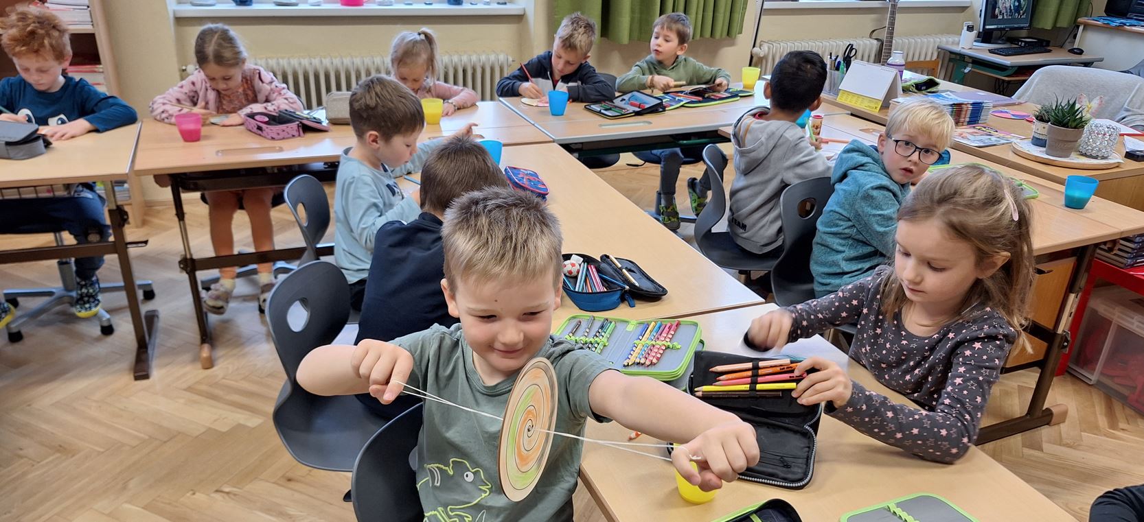 Doppelte "Nahtstellenarbeit" stand am 8.11.2024 bei uns am Bildungscampus auf dem Programm. Während die KIGA-Betreuerinnen mit den Vorschulkindern bei ihrer zukünftigen Lehrerin Frau Haider zu Gast waren, verbrachte Frau Heigl aus der Mittelschule eine Schulstunde bei ihrer zukünftigen Klasse in der Volksschule. Nach der Begrüßung in Frau Haiders Klasse, folgte eine Führung durch das Schulhaus, um die Kinder mit den Gegebenheiten vertraut zu machen. Danach konnten sie vorgefertigte Scheiben bemalen, die auf Schnüren befestigt durch schnelles Drehen ein tolles Muster ergeben.