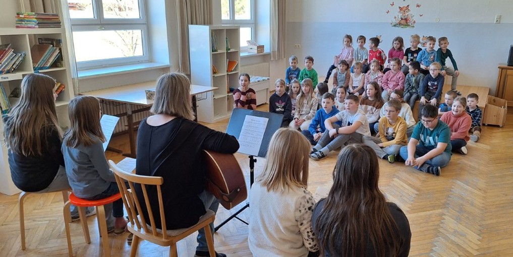 Nachdem zur Begrüßung im Leseraum ein gemeinsames Lied gesungen worden war (Foto unten), teilten sich die Kinder in zwei Gruppen auf. Jedes große Schulkind betreute dabei ein oder zwei Kindergartenkinder (Fotos rechts).