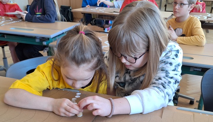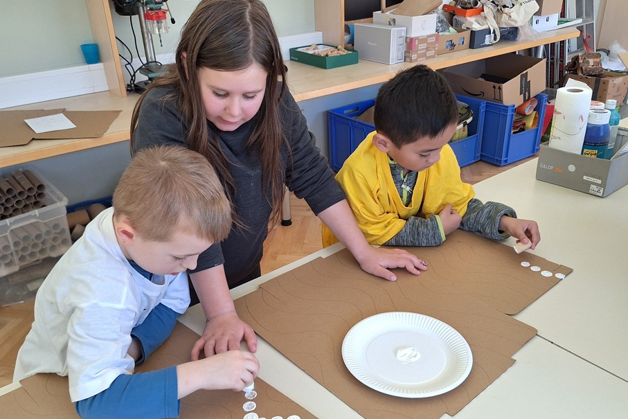Im Bastelraum sowie in der 4. Klasse wurden dann die Bastelschachteln für die 1. Klasse mit Stempeln bunt bedruckt.